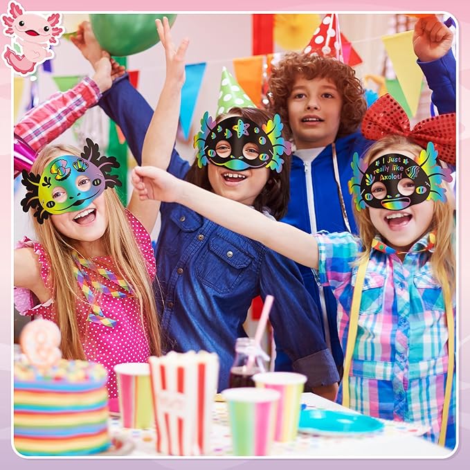 B1ykin 30Pcs Axolotl Scratch Mask Gift Set, DIY Magic Scratch Axolotl Masks Paper Art Craft Kit for Kids, Color Paper Party Favors for Girls Boys Birthday School Classroom Art Activity Project