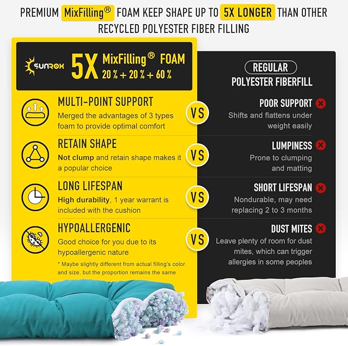 - 【FadeShield - UV Fade Resistant】FadeShield Proprietary Polyolefin are dependable indoor/outdoor performance fabrics, they are infused with antimiсrоbial silver Ion technology and can withstand 5 years of UV fade resistance, solution-dyed to make sure that each color is deeply ingrained in every fiber for continued vibrancy, even after heavy use. 80% water resistant (not entirely waterproof). We recommend bringing it indoors when it rains or when not in use to preserve its lifespan and keep it looking beautiful.