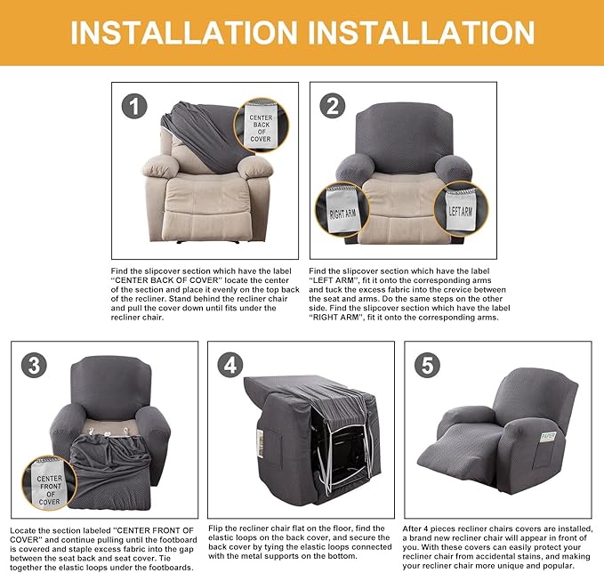 - Easy to Install - According to the user manual provided, this recliner cover is easy to install and has labels for the different cover positions. It's a quick and easy way to update the color or fabric of existing furniture, making it a great and affordable way to redecorate on a budget. It's perfect for families with kids, pets, or worn-out couches.