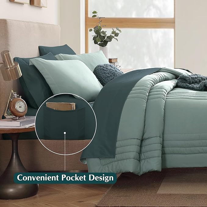 Monbix King Size Comforter Set - 7 Pieces Bed in a Bag King, Sage Green Bedding Sets with Comforter, All Seasons Comforter Bed Set with Sheets, Pillowcases & Shams