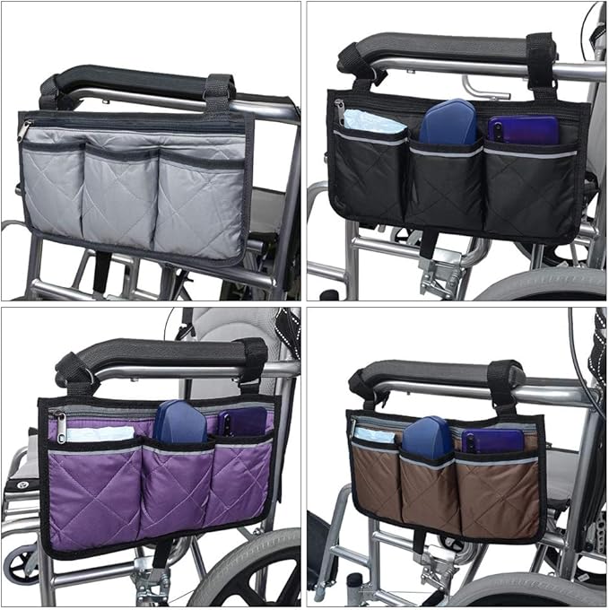 - MULTI POCKETS: Multi-pocket design, convenient to use. Keep your phone, wallet, snacks, medication, glasses case and other essentials within an easy arm's reach with this indispensable wheelchair ar