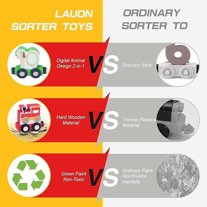 - Unique Double-Sided Design: 12 letter and number designs on one side and 12 different cute animal shapes patterns on the other side; Our wooden magnetic train set encourages letter and colour recognition, while also developing visual perception skills