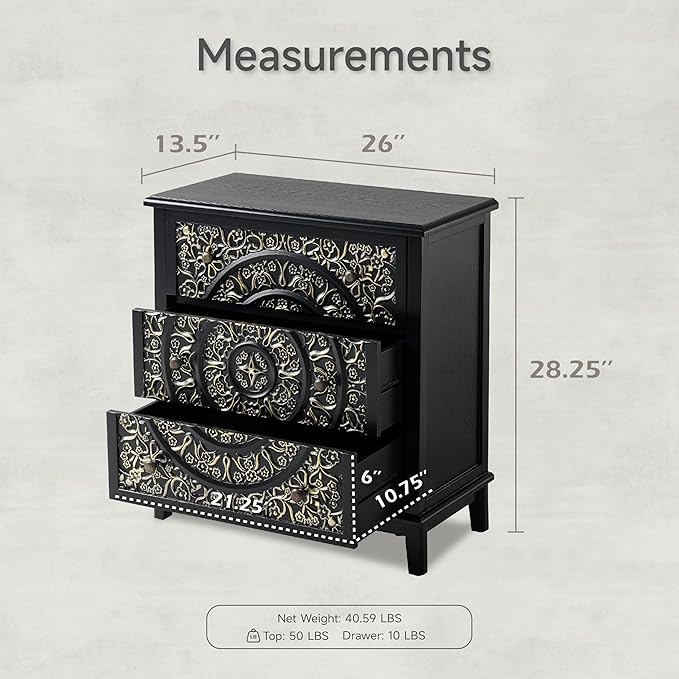 COZAYH 3-Drawer Fully-Assembled Flower Motif Dresser for French Country, Modern, Rustic Style, Distressed Finish, Gold & Black
