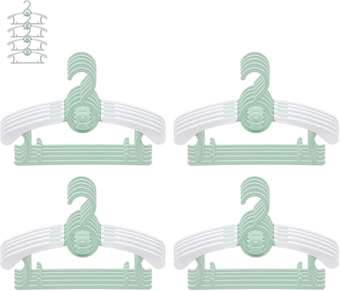 - 🐻 Set includes 20 green plastic baby hangers with adjustable arms 11" - 14" baby hangers for all sizes from newborn to adult. Children's hangers are specially designed for children and are sized to better fit children's clothing. Compared to adult hangers, children's hangers are usually lighter, easier to handle and safer for children.