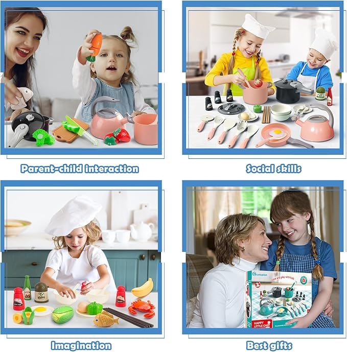 - 【Realistic Kitchen Playset & Food】Realistic cooking set encourages imagination, dexterity, and creative play, Teaches your little ones to be mother's little helper. The kettle can be filled with water and the spout can be pulled out, Give your child a gift that creates countless happy moments!