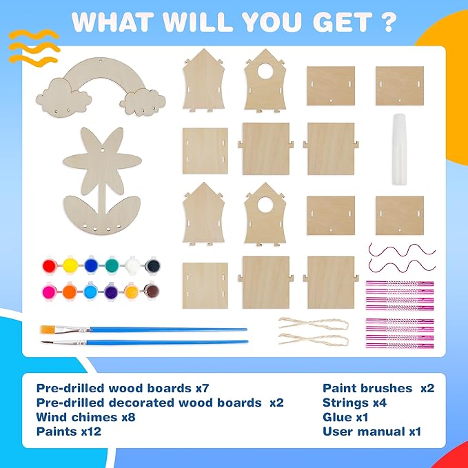 - DIY Miniature House Kit - BelloChiddo birdhouse kit crafts for kids ages 4-8 include 2 bird houses, 12 paints, 2 brushes, 8 wind chimes,and 4 strings. Made of natural solid wood, these bird house kits for children to build are safe and non-toxic. Let your kids make use of these craft kits to DIY their own bird house outdoor.