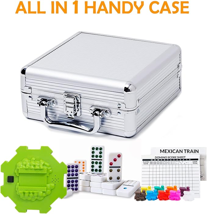 - GREAT FOR TRAVLING: Our double 12 dominoes come neatly packed in a sturdy case making them easy to store away when at home or on the go. The aluminum framed case make it effortless to protect Mexican train dominoes, reducing wear, tear and discoloration, making it a perfect travel game set.