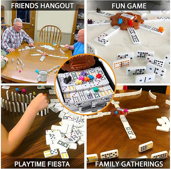 - DURABLE & COLORFUL: The standard size dominoes comes with off-white ivory tiles marked with bright dots. All the domino tiles are made of urea stone which gives a heavy solid feeling, engraved beautifully. This domino game set is a perfect present choice in various scenarios as it would bring nothing but joy to people you love.