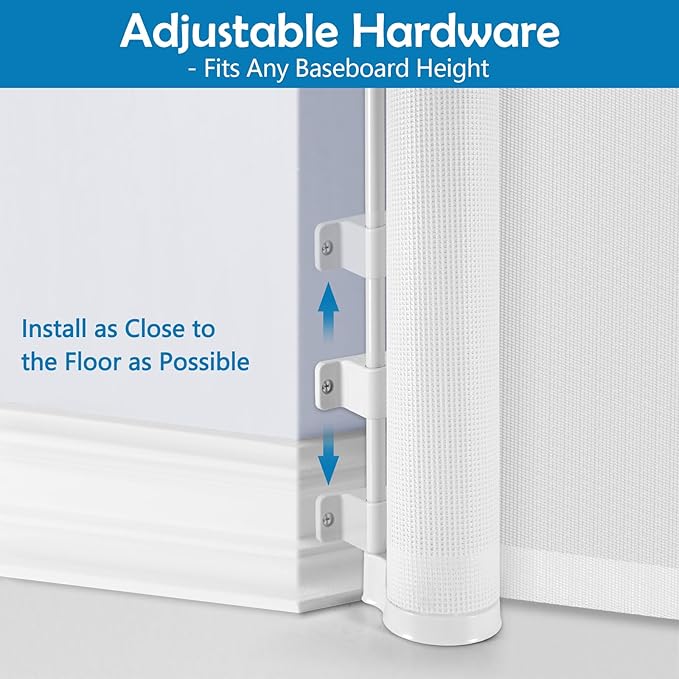 - Adjustable Hardware for Any Baseboard: No matter the height or style of your home's baseboards, our retractable gate comes with adjustable hardware, ensuring a seamless fit without the need for additional shims.