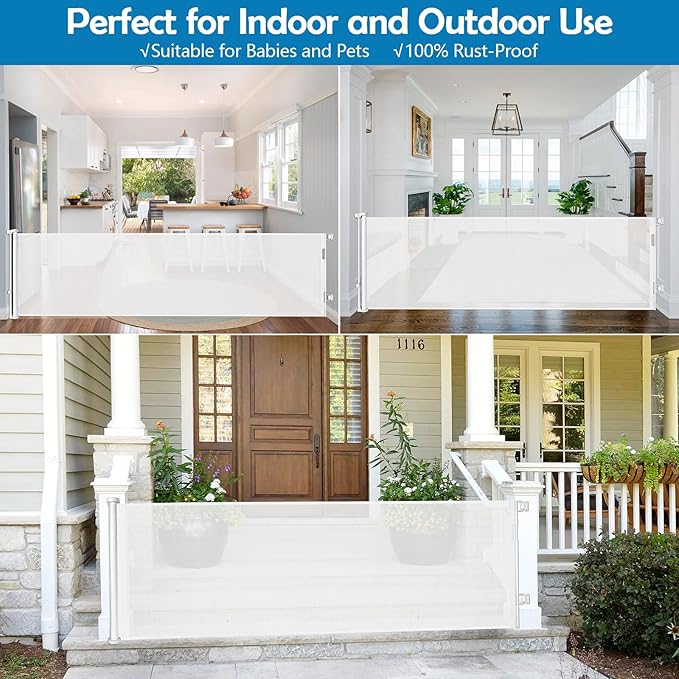 - 90-Inch Long Baby Gate for Versatile Spaces: Our retractable baby gates are designed to fit openings from 0-90" wide, allowing you to adjust the width as needed. It's perfect for doorways, hallways, kitchens, as well as outdoor porches, decks, and other wide openings.
