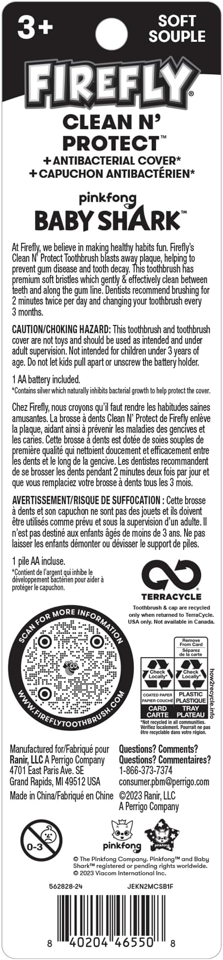 Firefly Clean N' Protect, Baby Shark Toothbrush with 3D Character Cover, Soft Bristles, Anti-Slip Grip Handle, Battery Included, Ages 3+, 1 Count