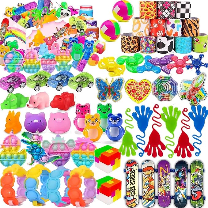 - Assortment Party Favors Toys Set: 4 pop bracelets, 4 cute pop fidget toys, 4 mini pop keychains, 4 pull back planes, 4 skateboard toys, 4 fidget spinners, 5 mochi squishy toys, 5 tumbler toys, 5 sticky hands, 5 animal pull back cars, 10 slap bracelets, 60 stickers. Total 114 pcs party favors toys.