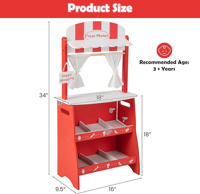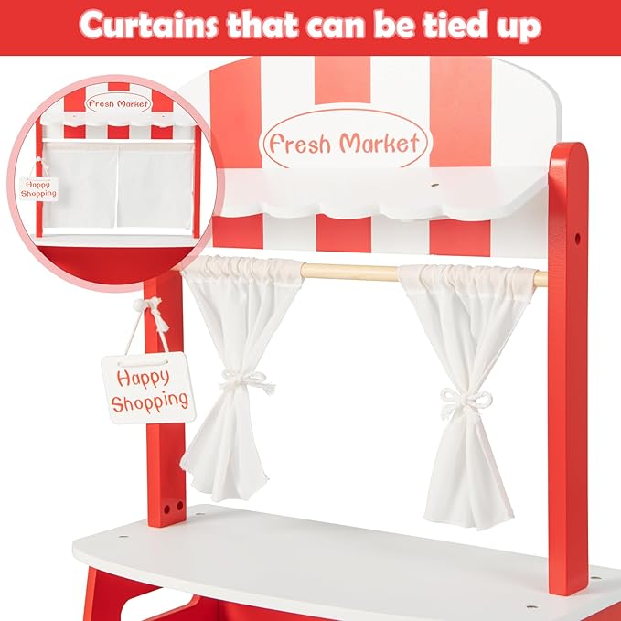 - Perfect Gift for Kids: Ignite your child's imagination and strengthen the parent-child bond through our captivating wooden toy playset. The storage shelves underneath the wooden market stand and the display platform provide ample space for toddlers to showcase their favorite toys. This is an ideal gift for kids over the age of 3.