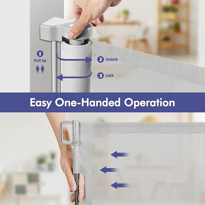 - [Retractable Gate to Save Space] - This retractable baby gate is easy to use in high traffic areas. When not in use or when guests are visiting, the large baby gate retracts to save space. Give your home more space and flexibility, and you don't have to worry about tripping over a bulky gate that's always in the way.