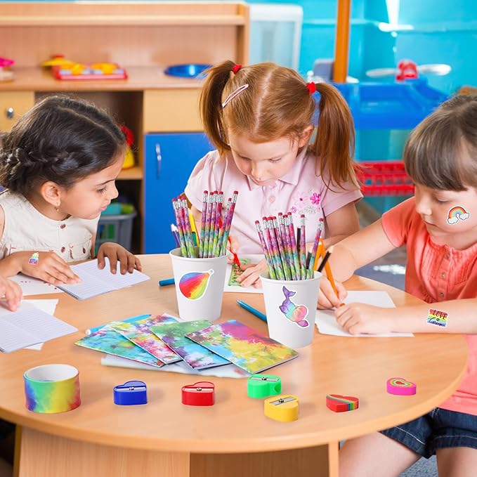 - Nice Tie Dye Party Favors Set: you will get 16 x mini tie dye notebooks (approx. 3.15 x 4.72 inches/ 8 x 12 cm), 16 x tie dye pattern keychain, 16 x tie dye slap bracelets, 16 x tie dye pencils, 16 x tie dye pencil sharpener, 16 x heart rainbow eraser, 16 x white organza bags, 16 x thanks cards, and 1 pack of 50 tie dye stickers, nice set to meet your various needs