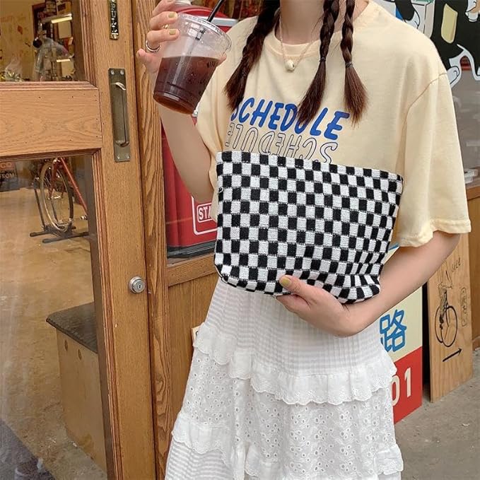 PAZIMIIK Knitted Checkered Makeup Bag Large Zipper Make Up Accessory Pouch for Purse Cosmetic Brush Bag for Travel Essential,Black