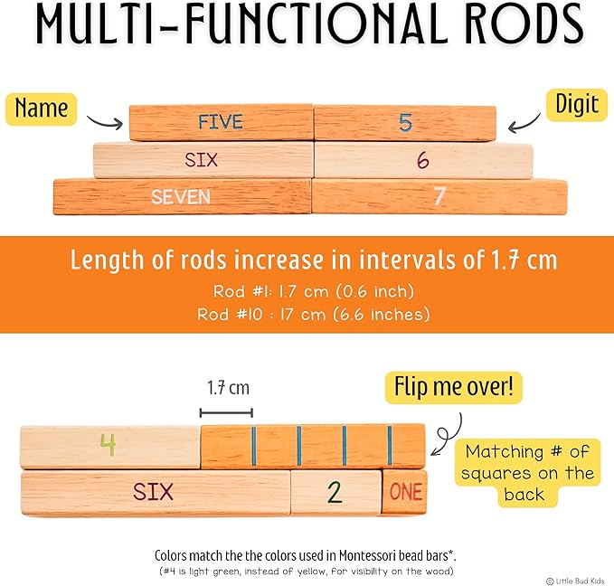 - IMPROVE ABSTRACT MATH SKILLS: Number rods provide multiple ways to reinforce knowledge of digits vs. written names and odd vs. even. Rods have matching number of squares on the back to help children with mental math. This allows kids to see, feel, and understand how numbers can be broken apart and joined together, which is the basis for multiplication, division, & fractions.