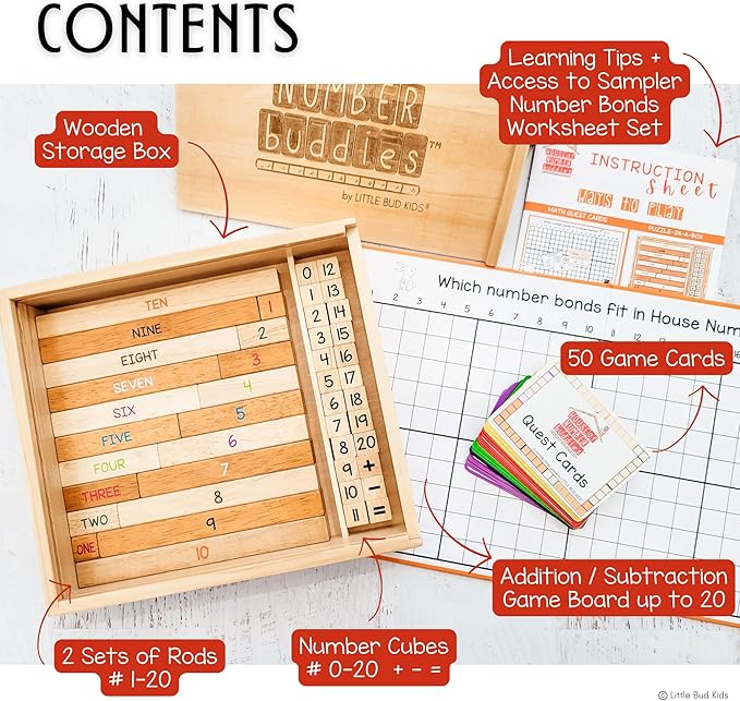 - MASTER NUMBER BONDS: Our number rods math board game teaches kids core math concepts - addition, subtraction, counting, and parts & wholes. This grow-with-your child, 3-in-1 set is a number puzzle for preschoolers and kindergarteners, an addition and subtraction math manipulative tool for 1st & 2nd graders, and a fun & cool math board game for all kids 4 - 8 years old.