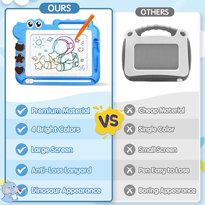 - Colorful Magnetic Drawing Board with Dinosaur Look: This cute dinosaur doodle board features four distinct color zones - blue, yellow, purple and green - the vibrant colors and rainbow creations will excite young artists, allowing kids to explore their creativity and easily draw colorful masterpieces, help baby color and shape cognition, explore creative thinking and strengthen kids' concentration. Plus, the sliding knob allows for endless drawing, whenever inspiration strikes
