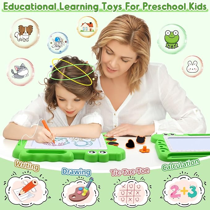 - Upgrade Pre-School Educational Toys: Magnetic drawing board is an educational toy, develop children's visual, hands-on ability, color recognition ability and imagination through drawing and playing, perfect for toddler girls boys. Upgrade board comes with bonus stamp shapes a bear, star, and love symbol-adding more fun and creativity to your child's art work, and stamps can be placed in the corresponding hole of the board, ensure they won't get lost