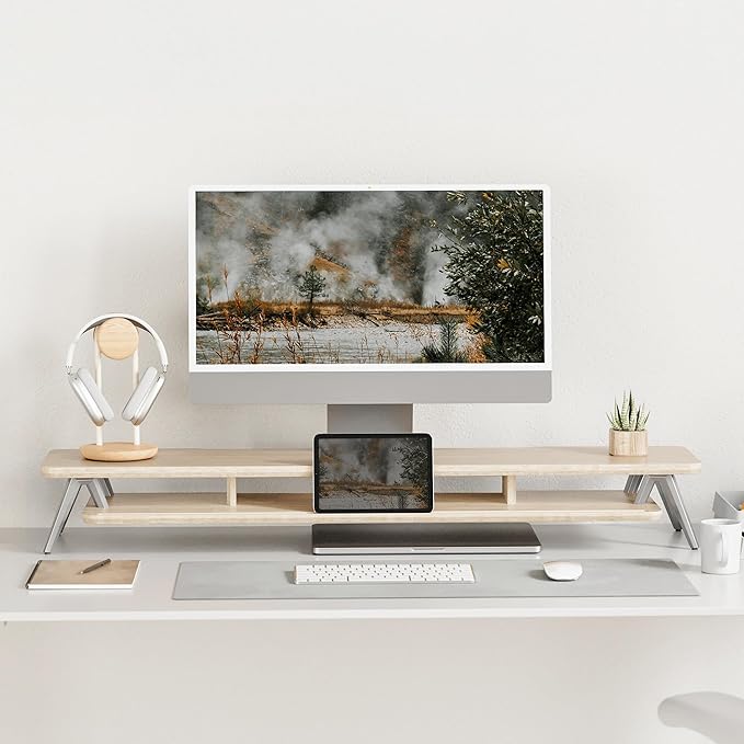 - 【2 TIER DESKTOP ORGANIZER】At longest 42.5inch wide,longer size with more space. This laptop riser is big enough to support two monitors. It has 1 universal device holder slot and 3 high capacity compartments. You can easily store your office accessories & supplies under your monitor stand to keep your desktop tidy. Our monitor stand rise comes with cable management slots that can make your cord stay organized.