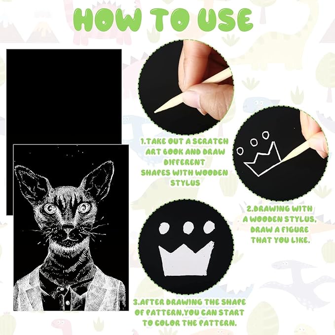 - Save Your Time and Energy: the scratch paper art set is easy to use, which is equipped with wooden stylus, you only need to gently use the wooden stylus to scratch off the black coating, the operation process is simple and convenient, won't take too much time and energy, and cultivate your focus
