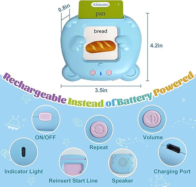 - ✨【Lightweight and Rechargeable】 - This flash cards toy (Bilingual Spanish English version) for kids is designed to be portable and lightweight, with its size of 3.54 X 4.20 inches, and weight is only about 65g, kids can definitely bring this anywhere! It's also equipped with a rechargeable battery and has its own USB cable so it can be used right away once you receive it, and can easily charge once it runs out of battery!