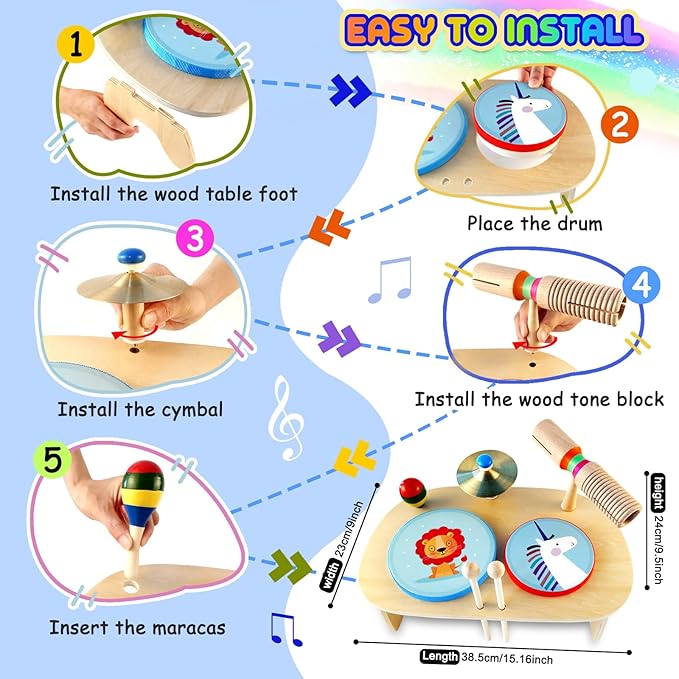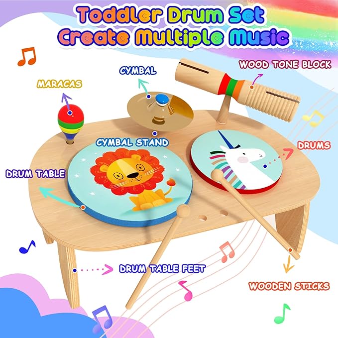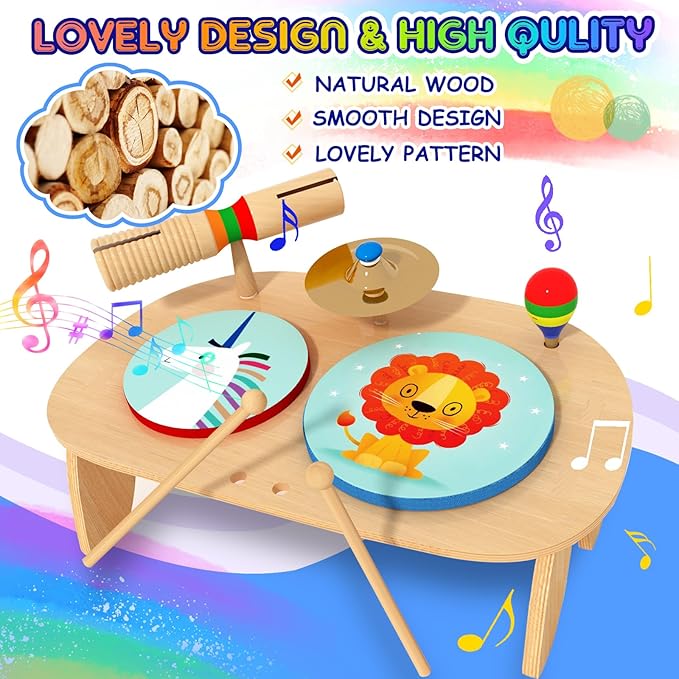 - đĽ ăKIDS SAFE MATERIALSă: The kids drum set is made of eco-friendly & natural wood material with environmental water-based paint, and CPC, CE are approved. Each corner has adopted a rounded process and there will be no sharp or rough parts to hurt your baby's hands. For younger kids under 3 years old, please be accompanied by adults when playing.