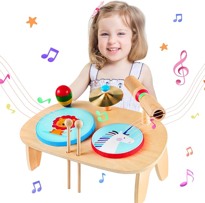 - đľăALL IN ONE TODDLER DRUM SETă:This wooden musical table has six percussion instruments including a cymbal, a wood tone block ,a maracas,a 6 inch drum, a 5 inch drum and two wooden drumsticks.