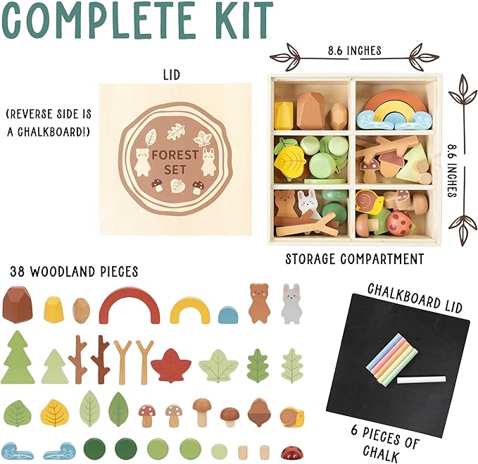 - Everything You Need: Make play time complete with our forest themed wooden sensory bin play set. The tinker toys box includes 38 wooden pieces, six pieces of chalk, and a chalkboard to help kids develop important skills through sensory exploration and stacking.