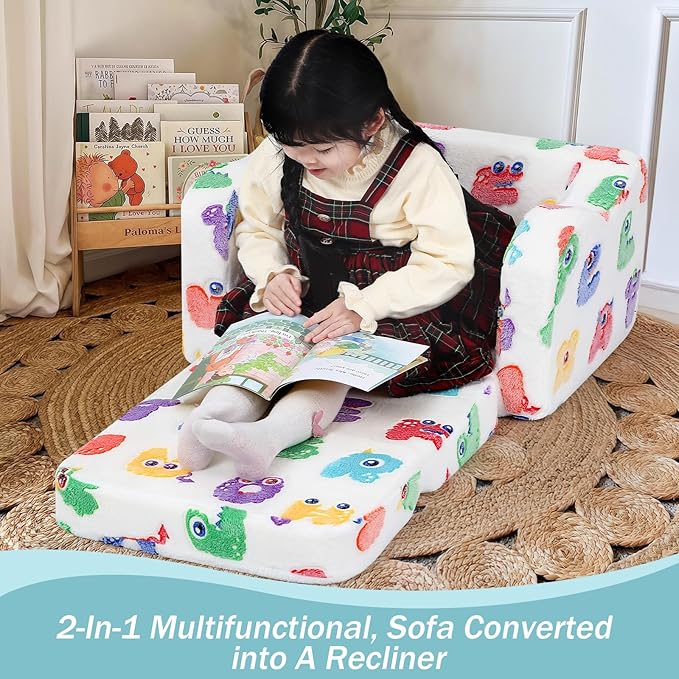 - 2-in-1 Convertible Design: Quickly transforms from a fold-out chair into a toddler lounger sofa. Thick plush fabric and supportive foam provide a cozy spot for sitting or lying down, enhancing comfort during rest or play