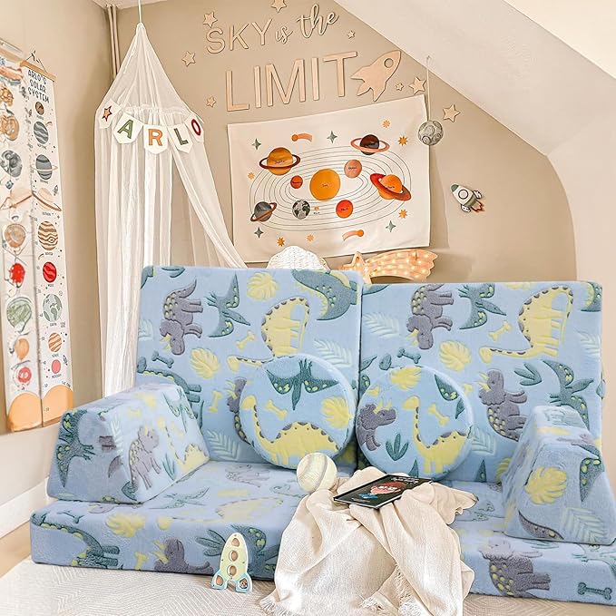 MeMoreCool Modular Glow Sofa for Kids, 8-Piece Convertible Foam Couch Play Set with Glowing Dinosaur Design for Toddlers and Playroom