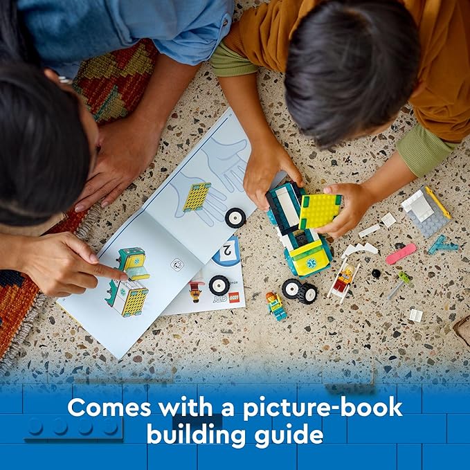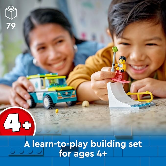 - Toy ambulance playset – Join your little builder for quality playtime with this LEGO City Emergency Ambulance and Snowboarder building set for kids aged 4 and up