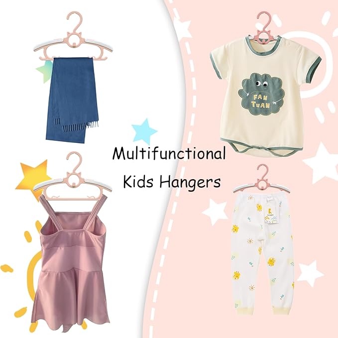 - 【Space Saving Hangers 】Each kid hanger has an independent projecting hook design, which makes it possible to stack the children's hangers one by one, help for expanding your closet space, and the connection hooks allow you to hanging enable you to hang a jacket with the matching pants, ties or hats together, Will be easy for parents to see it’s complete outfit! helping you save time in matching outfits and keeping your Closet organizers and storage