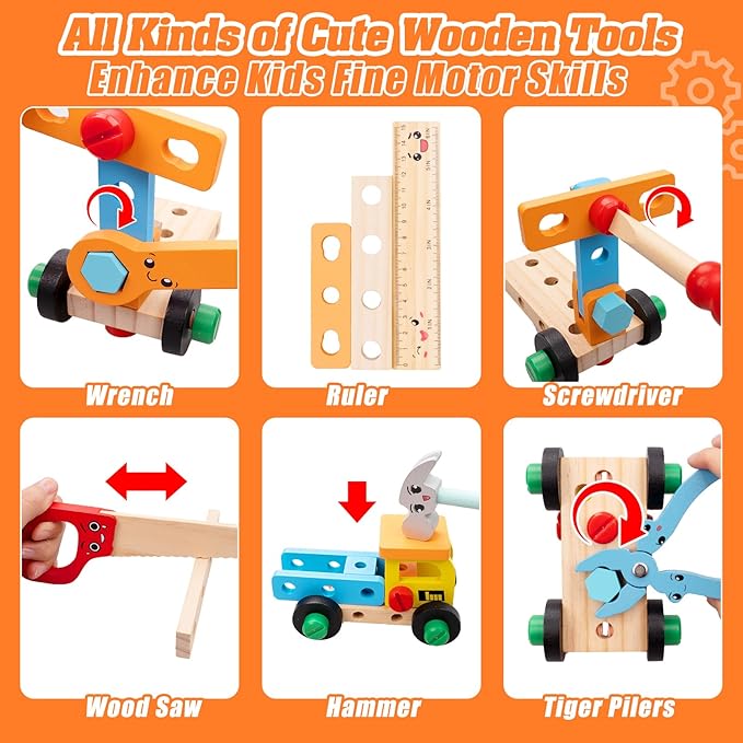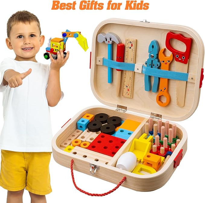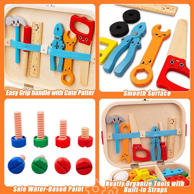 - 【ALL-IN-ONE 56 Pcs Kids Tool Set for Toddlers】: Our multi-functional wooden tool box is ready. The colorful and varied accessories and parts allow children to learn and grow in the game. This toddler tool set includes all the accessories and parts such as hammers, wrenches, pliers, rulers, saws, screwdrivers, nuts and bolts, making the children feel like they have a real toolbox. This wooden tool set is not only their toy, but also their tool for understanding the world.