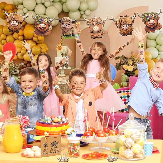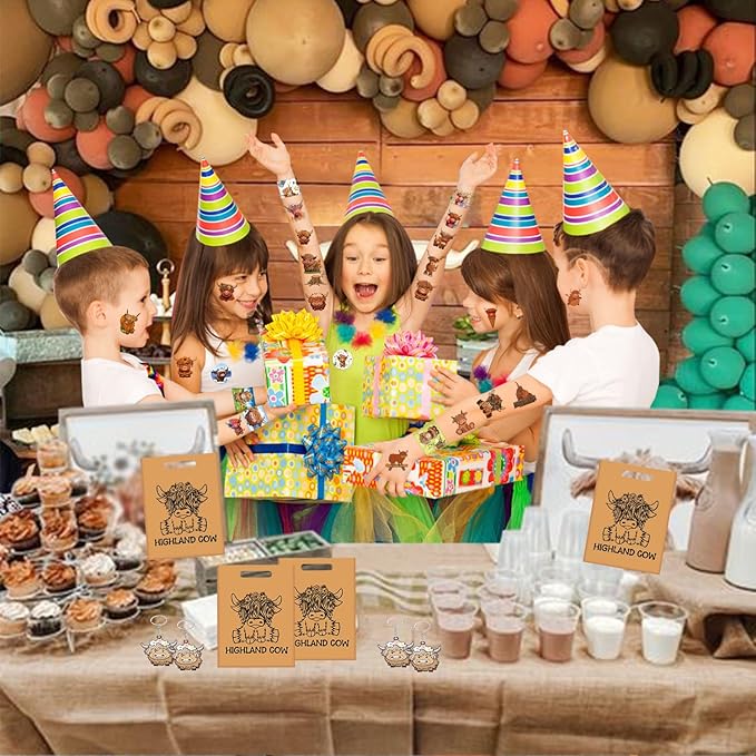 - PACKAGE INCLUDE: Highland cow party favors include 12pcs highland cow slap bracelets, 12pcs highland cow key chains, 12pcs highland cow badge pins, 12pcs highland cow gift bags, 12 sheet highland cow temporary tattoo stickers (72 Patterns). Enough quantity to meet your highland cow party needs