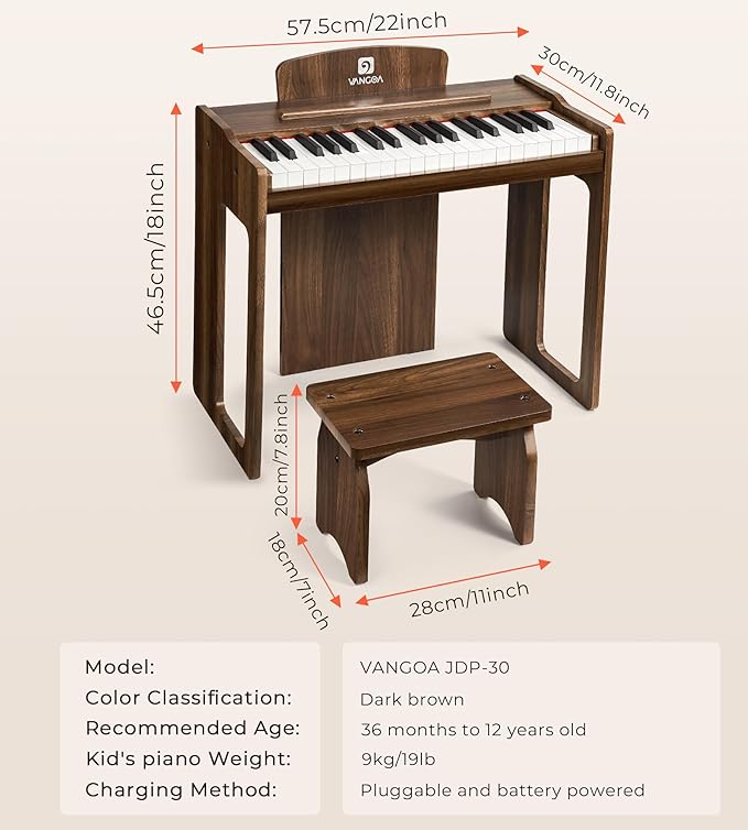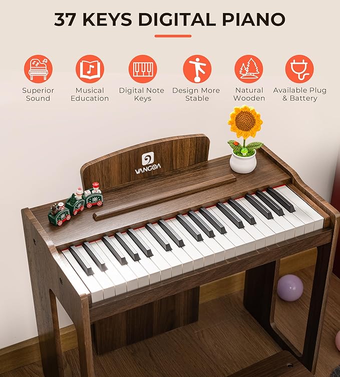 Vangoa Kids Piano Keyboard, 37 Keys Digital Piano for Kids, Music Educational Instrument Toy, Wood Piano for Girls and Boys, Dark Brown
