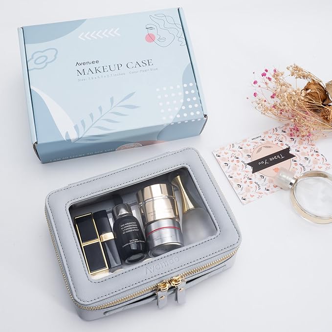 - ❤【LUXURY DESIGN】Measuring 7.9” x 5.7” x 2.7”(20 cm x14.5cm x 7cm), our clear makeup bag is leek and stylish, this makeup travel organizer was designed in a minimalist boxy shape and an elegant pearl blue color. Crafted in beautiful PU leather and finished with polished hardware, it's the clear pouch you'd be happy with sitting out on display beside you.