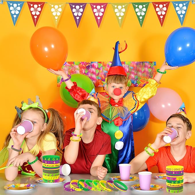 - Application Scenario: These Mardi Gras party favors are suitable for most kinds of party, music festivals, carnivals and raves. Whether dancing or partying on the city streets at night, the Mardi Gras silicone bracelets will be an ideal decoration for you. In addition, the mardi gras rubber wristbands are also wonderful gifts to give the essence of the carnival to your friends and family