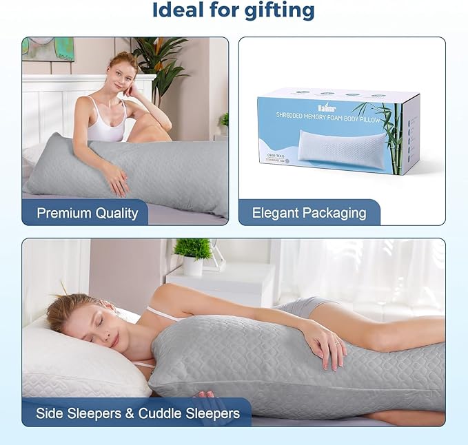 - Memory Foam Body Pillow: Our body pillows for adult will also improve your sleeping quality. With Shredded Memory Foam Body Pillow, you could get better sleeping experience. We also provide a Grey cooling pillowcase so that you could stay cool at night even in hot summer.