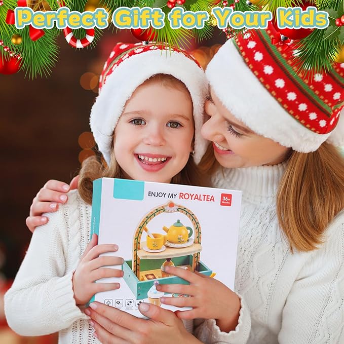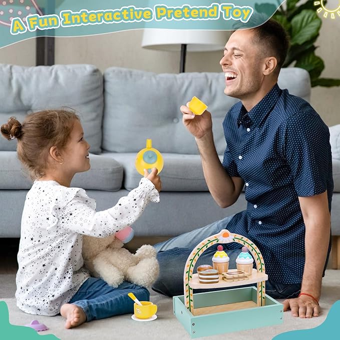 - Fun Tea Party Time for Kids: Your kids are ready for a fun tea time with friends and family, desserts, drinks and conversation! Set up a cake stand with a dessert tower and tray filled with delicious desserts, pour tea or coffee into cups and start tea time! Realistic wooden tea set for screenless fun and unforgettable memories for kids.