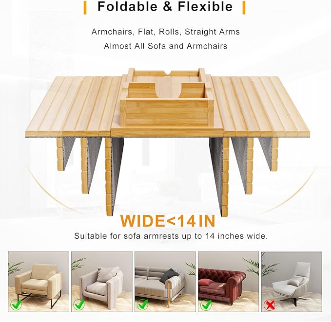 - ✅ 【Fits a Variety of Sofa Armrests】Our sofa tray table for couches applies to most sofas, for wide armchairs, flat, rolls, and straight arms, Our couch arm side table fits arms 4.5” (flat) to 14” rolls or straight arms.