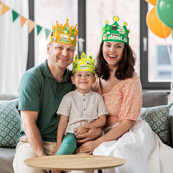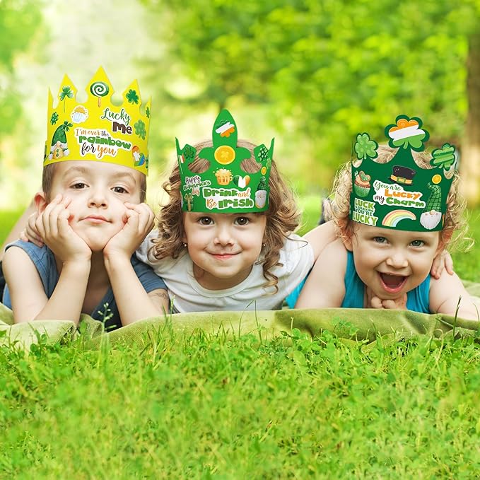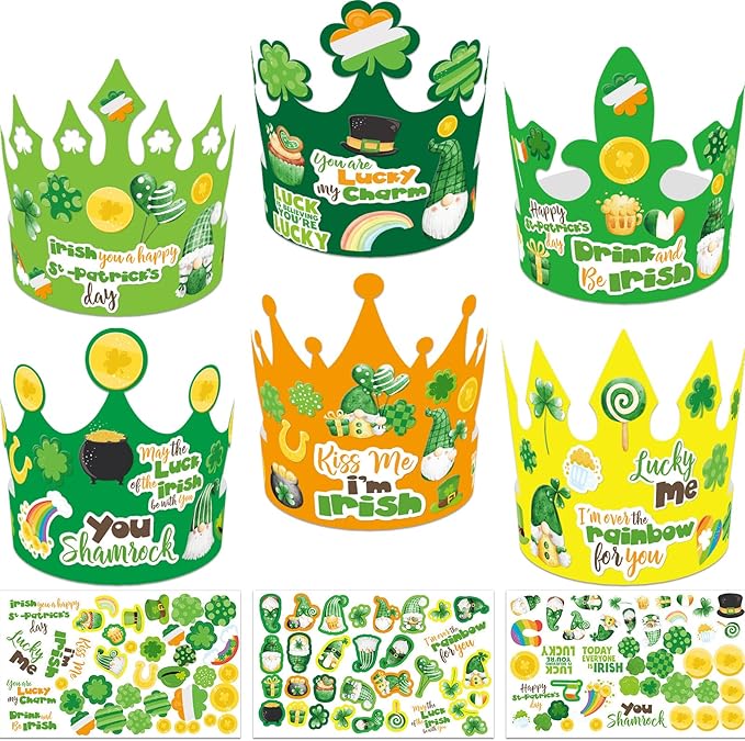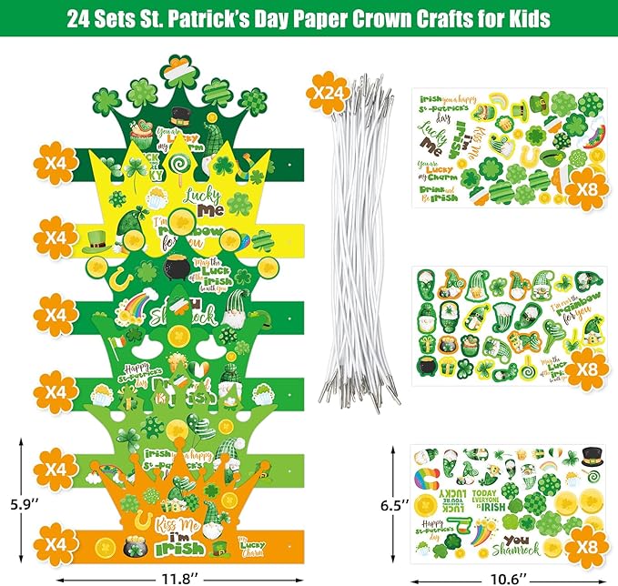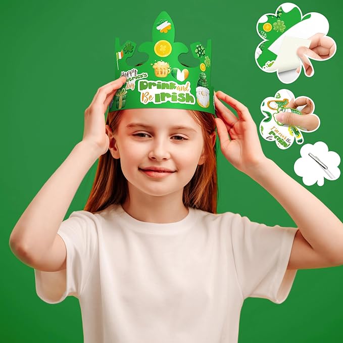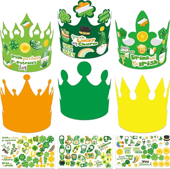 - Package Includes: 24 St. Patrick's Day paper crowns in 6 styles, 24 elastic ropes, 24 sheets St. Patrick's Day shamrock stickers, which is a good combination to satisfy your DIY needs and perfect for large parties or classroom activities.
