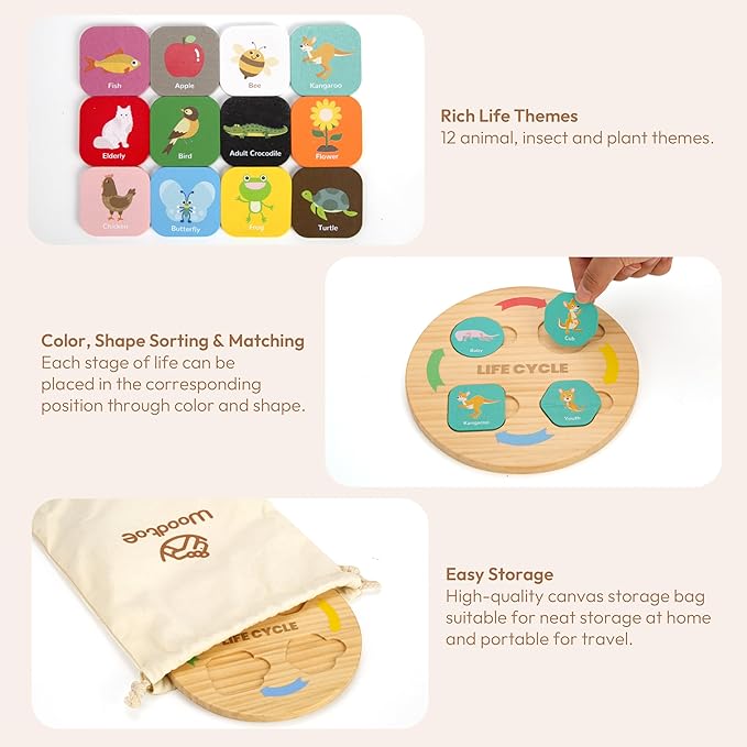 Life Cycle Toys for Kids, 12 Themes Montessori Preschool Science Center Materials, Wooden Learning & Educational Toys for Toddlers, Learning Game Travel Toy Birthday for Boys Girls Age 3-6