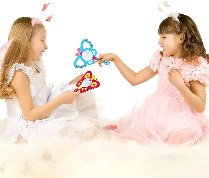 - Butterfly Craft for Kids: This wooden DIY mirror includes 12 x unfinished wooden butterfly cutout , 9 x mirrors (4 round, 5 heart), 2x paiting brushes(there no paint included) ,1x rhinestone sticker, has enough accessories to make wooden mirrors together.Kids can share this butterfly mirror with friends and spend time together.