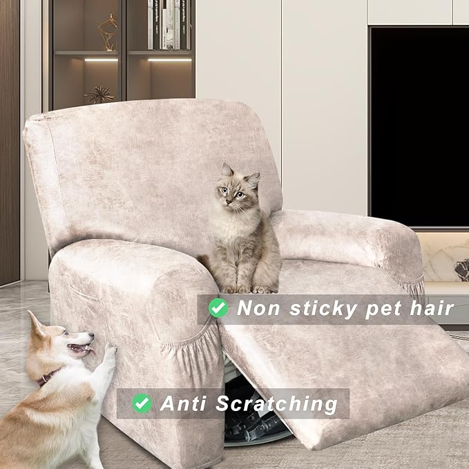 Like Leather Recliner Chair Covers, 4 Pieces Lazy Boy Recliner Cover That Stay in Place, Soft Stretch Leather Grain Covers for Recliner Covers for Large Recliner Slipcover (Beige 4)
