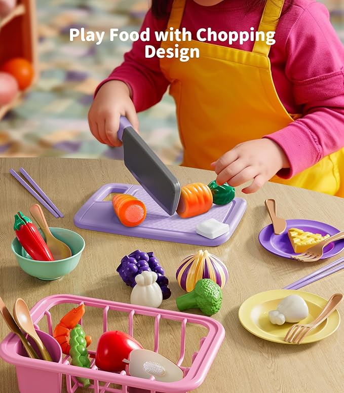 - Simulated Sink Toy: Includes 30Pcs accessories such as plastic cups, plastic plates, plastic knife and fork sets, and food toys. It features a detachable draining rack for filtering water and storing utensils. The rich accessories allow children to engage in role-playing, enhance their color recognition skills, and develop their organizing and storage abilities.