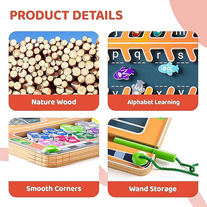- Maze Design: The wooden toy features a maze with various paths and obstacles; Children have to navigate the magnetic letters through the maze; finding the correct path to complete words or reach a specific target; It challenges their problem-solving skills and spatial awareness