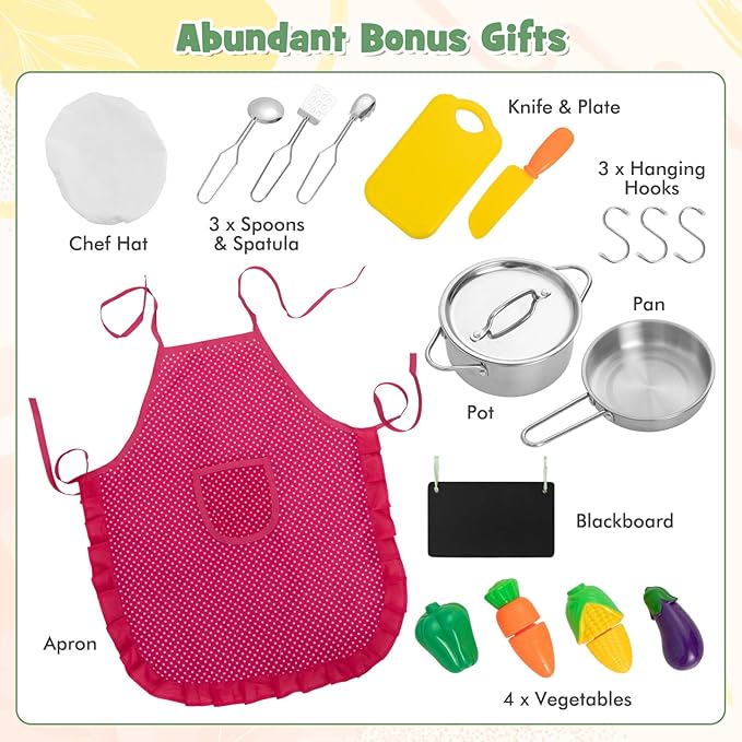 • 【17 Accessories Included】: This wooden play kitchen for kids comes with apron, chef hat, blackboard, pot, pan, knife & plate, 4 × vegetables, 3 × spoons & spatula and 3 × hanging hooks. Additionally, the ASTM and CPSIA certifications bring additional reliability.