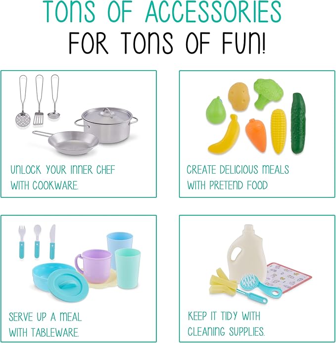 • BONUS TOOLS & ACCESSORIES | Tots Can Start Playing Straight Out the Box with Free Kitchen Toys [Pot w/ Lid, Frying Pan, Spatula, Whisk, Food, Cleaning Supply, Tableware] for Creative Play | Kitchen Also Features Other Authentic Details Like Lights, Sounds, Clicking Knobs, Door Handles, & Cabinet Windows